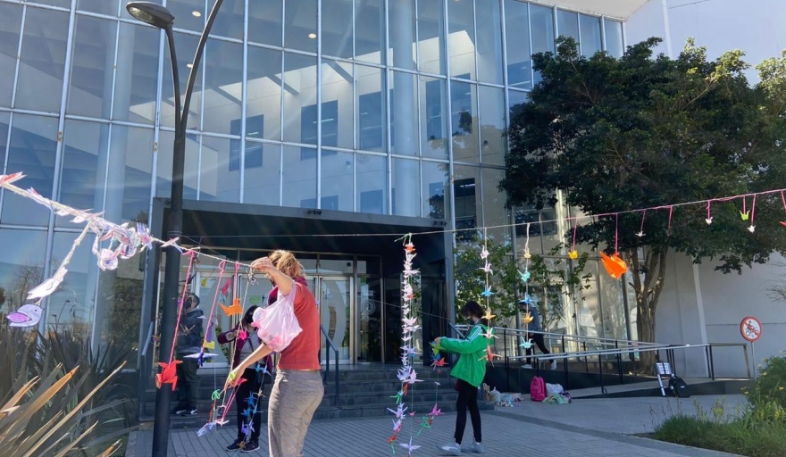Docentes de los Institutos de Enseñanza Artística, colgaron grullas en la puerta del palacio municipal para reclamar que se pague a los docentes de IMEPA que tomaron sus cargo en Acto Público del 5 de Marzo.