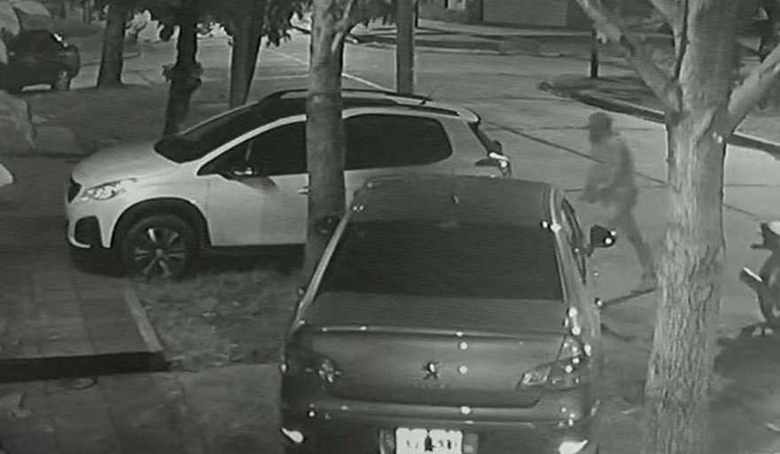 Uno de ellos baja y se acerca al auto de la víctima que estaba estacionado sobre la vereda. El delincuente no pudo abrir la puerta del lado del conductor al haber un árbol. Fue entonces que forzó la puerta del acompañante, la abrió en pocos segundos y escapó del lugar en contramano.