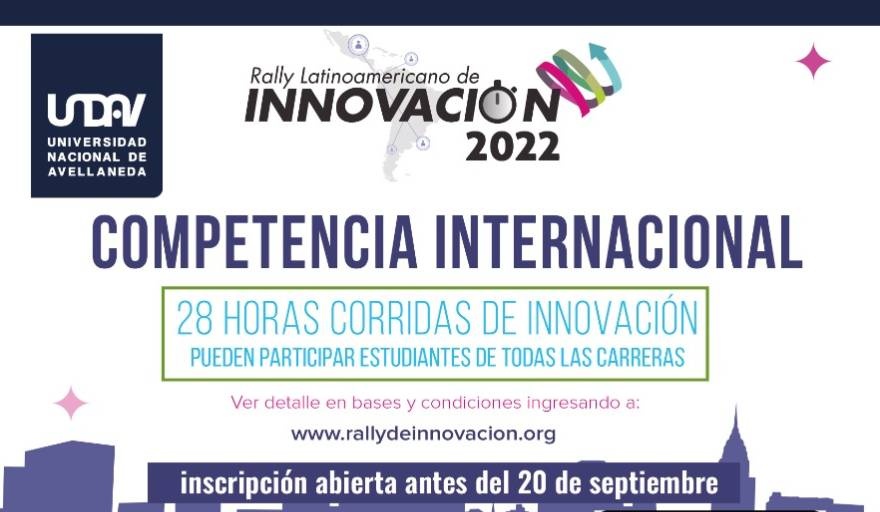 La Universidad Nacional de Avellaneda será nuevamente sede de la competencia internacional Rally Latinoamericano de Innovación 2022 que se llevará a cabo los días 23 y 24 de septiembre de 2022 en la modalidad híbrida, con el objetivo de fomentar la innovación abierta en las facultades y escuelas de ingeniería de Latinoamérica, que se desarrolla durante 28 horas consecutivas y en simultáneo en todas las sedes de los países participantes.
