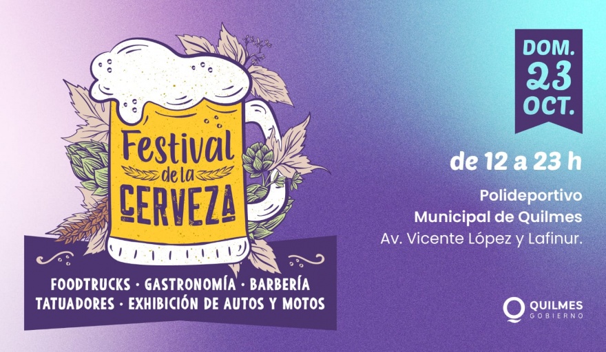 El Municipio de Quilmes invita a los quilmeños y a las quilmeñas a participar del Primer Festival de la Cerveza Quilmeña que se realizará el próximo domingo 23 de octubre, de 12 a 23, en el Polideportivo Municipal, ubicado en el bulevar Indio Gómez (Vicente López) y Lafinur, en Quilmes Oeste, y contará con puestos de gastronomía, foodtrucks, barberías, tatuadores y una exhibición de autos y motos.