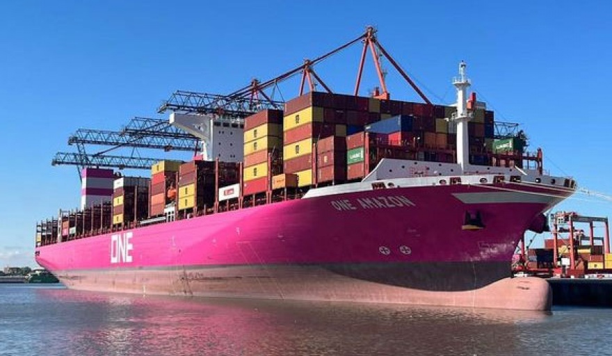El puerto de Dock Sud, en el partido de Avellenada, tiene en una de sus terminales al megabuque japonés One Amazon, del armador ONE Latin America, un navío que forma parte del servicio que une Asia con la costa este sudamericana.