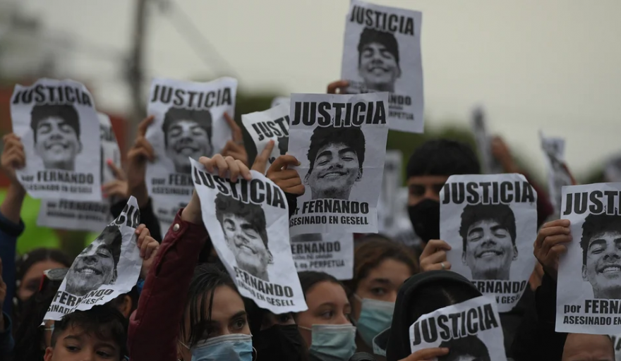 Máximo Thomsen (23), Enzo Comelli (22), Matías Benicelli (23), Blas Cinalli (21), Ayrton Viollaz (23), y Luciano (21), Ciro (22) y Lucas Pertossi (23) son los acusados del asesinato de Fernando Baéz Sosa. Éste lunes se inició el juicio y fueron trasladados a la cárcel de Dolores para participar de las respectivas audiencias que continuaron hoy por la mañana. Están imputados por matar a golpes al joven de 18 años a la salida de “Le Brique”, un boliche bailable en Villa Gesell, el 18 enero de 2020