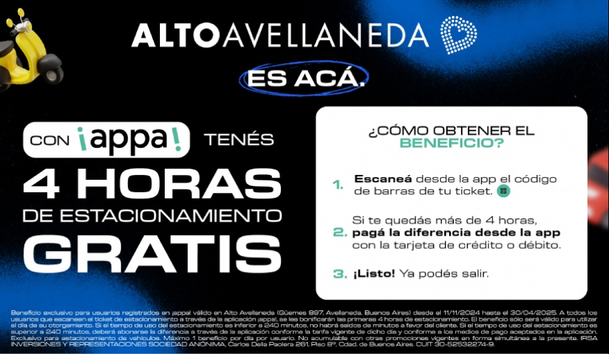 Con el fin de mejorar la experiencia de sus visitantes y asegurar un servicio de mayor calidad, Alto Avellaneda implementará el cobro en su estacionamiento. Sin embargo, todos los clientes que utilicen la aplicación ¡appa! Podrán disfrutar de las primeras 4 horas de estacionamiento de forma gratuita, facilitando así sus visitas al centro comercial.