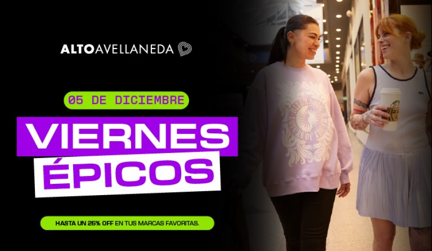 Este viernes 5 de diciembre, Alto Avellaneda invita a sus visitantes a una nueva edición de su programa de descuentos y beneficios: los Viernes Épicos. Todos los locales adheridos estarán señalizados con una comunicación especial, y los clientes podrán acceder a descuentos de hasta 25-30 % según la marca, mediante un sistema ágil y digital.